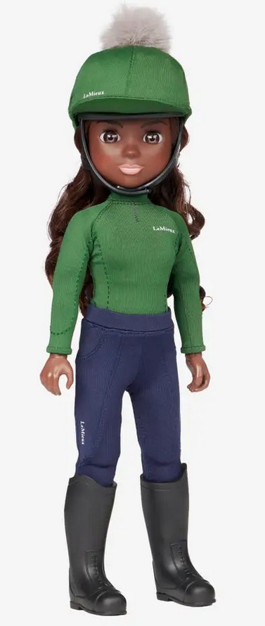 One of three interactive, fully articulated, high-quality equestrian dolls with individual personalities and matching outfits in LeMieux core colours, Maya has luscious, real-feel, brushable long dark hair and natural eyelashes. She comes wearing removable replica LeMieux riding wear in Hunter Green, with a removable riding helmet and boots.